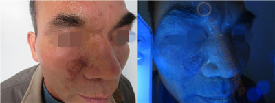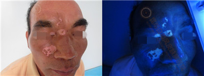 ▲检 查:1、wood灯:面部白斑色素脱失严重