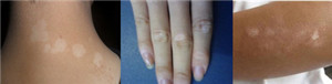 第三、白癜风病变呈纯白色圆形或不规则的脱失斑,其内毛发可变白或正常,但皮肤无其它变化,亦无自觉症状。表面光滑,边界清楚,边缘色素增多。